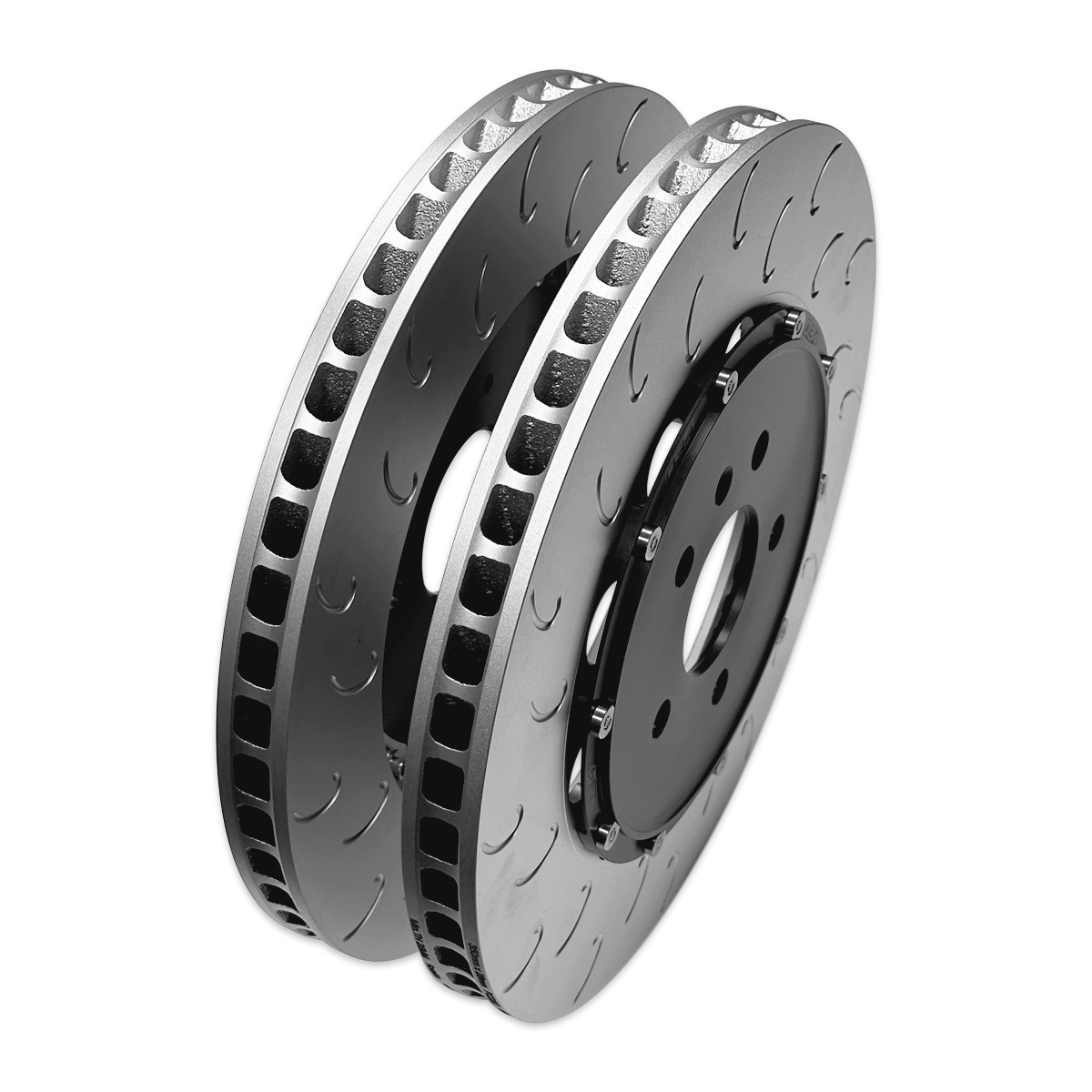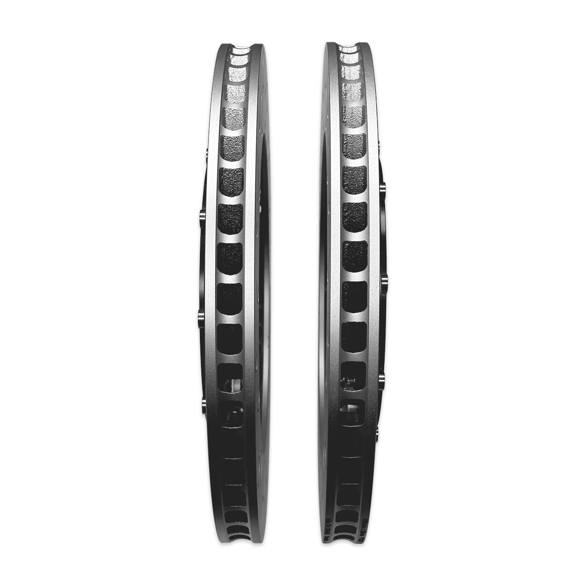 The central hat portion of the 034Motorsport rotor is made of 6061-T6 aircraft specification aluminum. The disc is constructed out of a proprietary metal alloy that can withstand immense braking temperatures while holding form allowing hard street use and long days at the track allowing you to drive versus working on the car. From the factory, the same rotor is used on both sides of the C8 S6/S7, D5 A8/S8, & 4M/4M.5 Q7/SQ7/Q8/SQ8, leading to one side having incorrect venting and cooling effects. The 034Motorsport 2-Piece Floating Front Brake Rotor Upgrade Kit utilizes 72 directionally curved vanes properly oriented for each side of the vehicle to forcefully flow cool air through both rotors to dissipate heat equally.